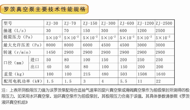 ●不可單獨使用,須配置前級泵。不允許在大氣壓力下啟動,待前級泵將羅茨泵入口壓力抽到允許入口壓力時方可啟動。前級泵一-般為水環式真空泵、油環式真空泵、油封式機械泵等。